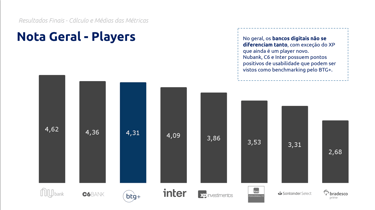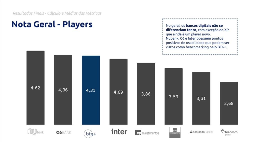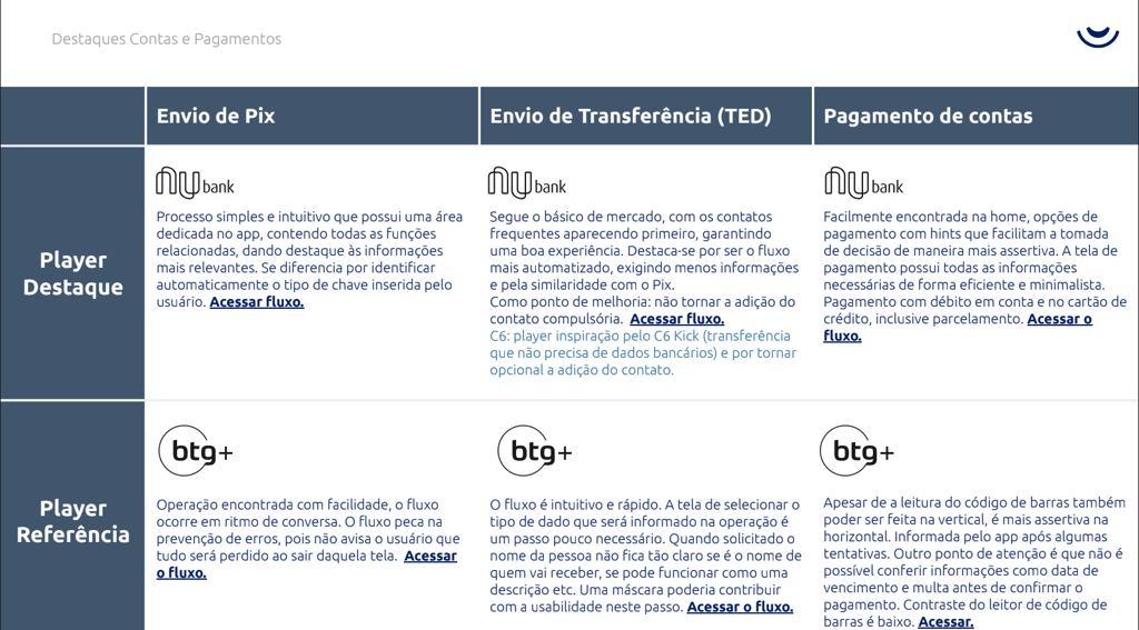 A entrega foi composta por análise de 8 players btg+, Inter, Nubank, C6 Bank, XP Investimentos, Itaú Personalité, Bradesco Prime e Santader Select: Fluxos (Pix, TED, Pagamento de contas, Pagamento de tributos, DDA Débito automático, Contratação de cartão de crédito, Cartão virtual, Cartão adicional, digital first, Gestão de limites, Programa de fidelidade, Primeiro acesso, Insights, Benefícios, Recarga, Investimento, Empréstimo), Rancking dos destaques, Estrelas (Escala de Diferencial Semântico)